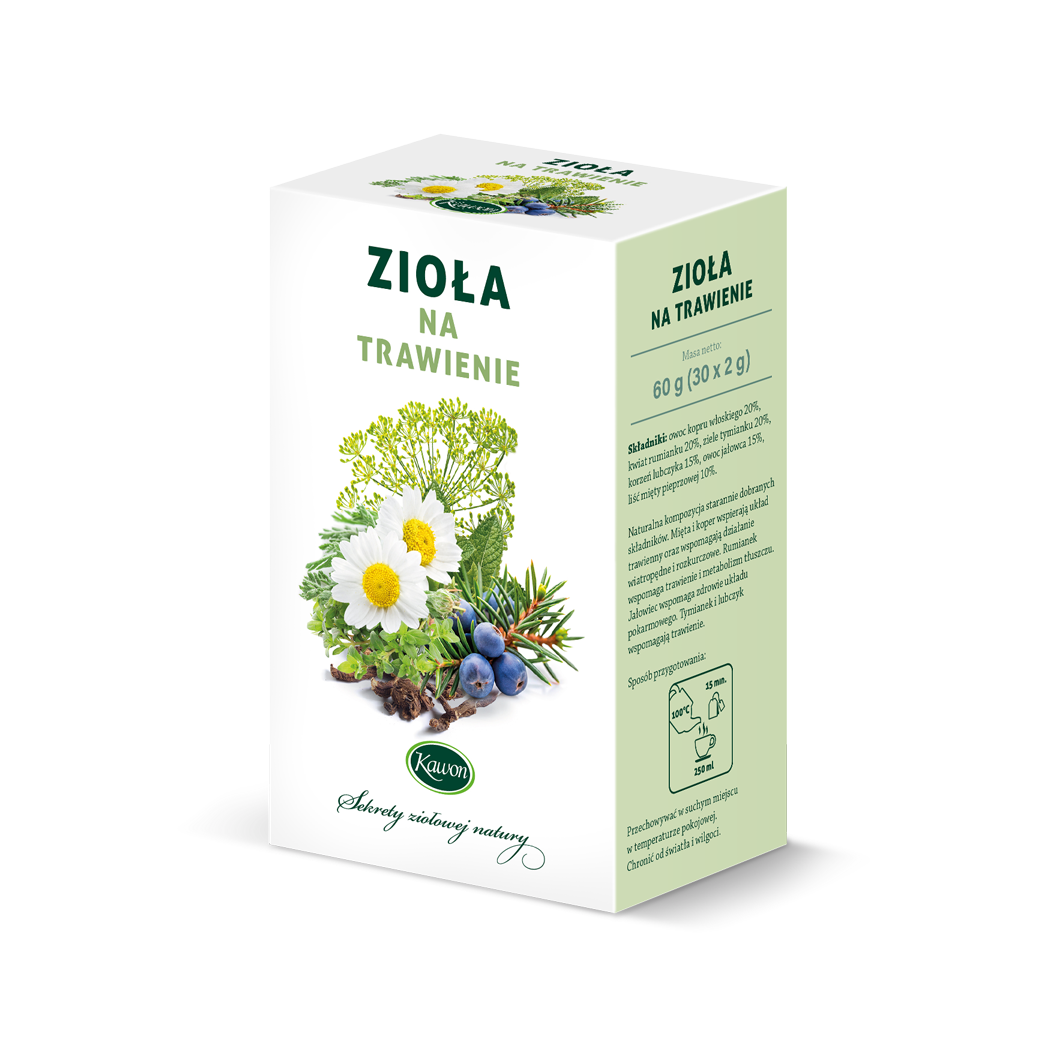 Rumianek wspomaga trawienie i metabolizm tłuszczu. Jałowiec wspomaga zdrowie układu pokarmowego. Tymianek i lubczyk wspomagają trawienie.